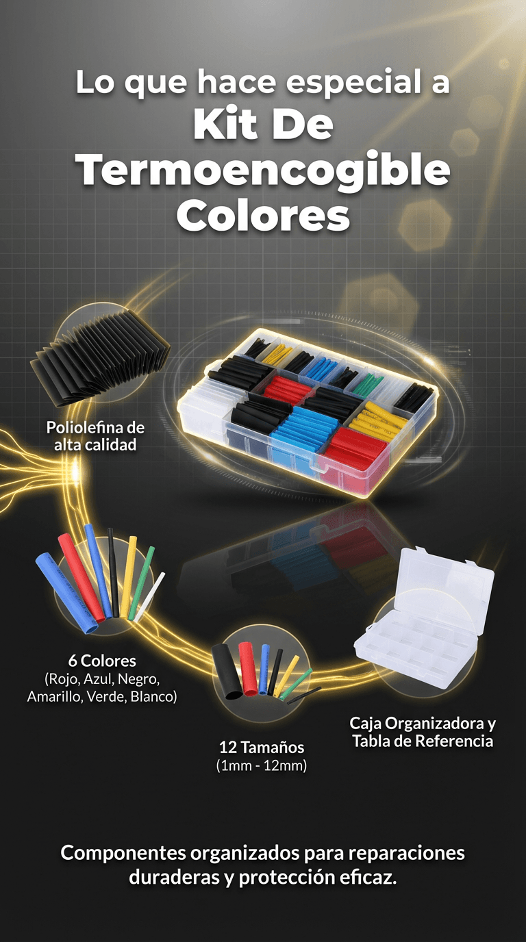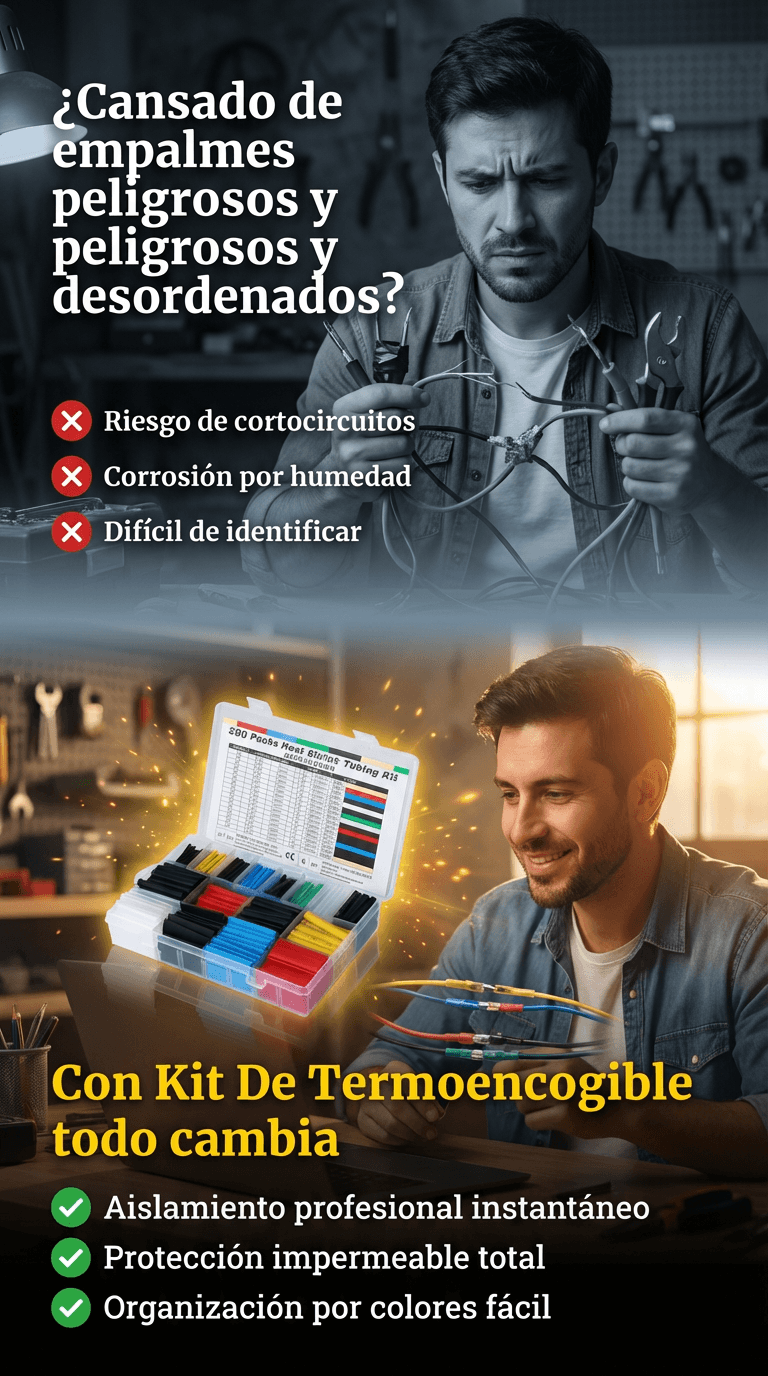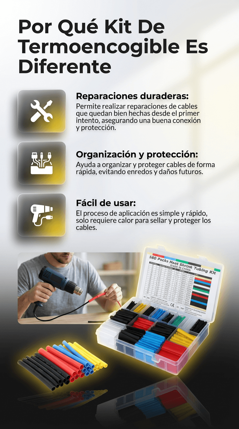 ¿Cables Rotos o Desordenados? ¡Arreglos Rápidos y Profesionales! Elimina el desorden y riesgos. Este kit de 580 tubos termoencogibles sella, protege y organiza tus cables en segundos contra agua y desgaste, incluso sin experiencia.