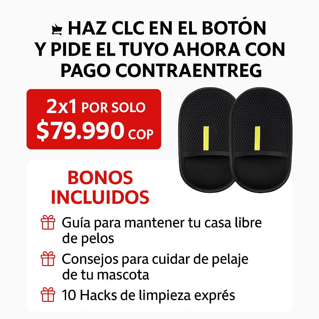 El Guante Removedor de Pelos Reutilizable es la solución definitiva. Gracias a su superficie electrostática, atrapa al instante los pelos y pelusas en ropa, sofás, tapetes, camas y hasta el carro. Solo pásalo una vez y disfruta de un resultado impecable en segundos. ✨