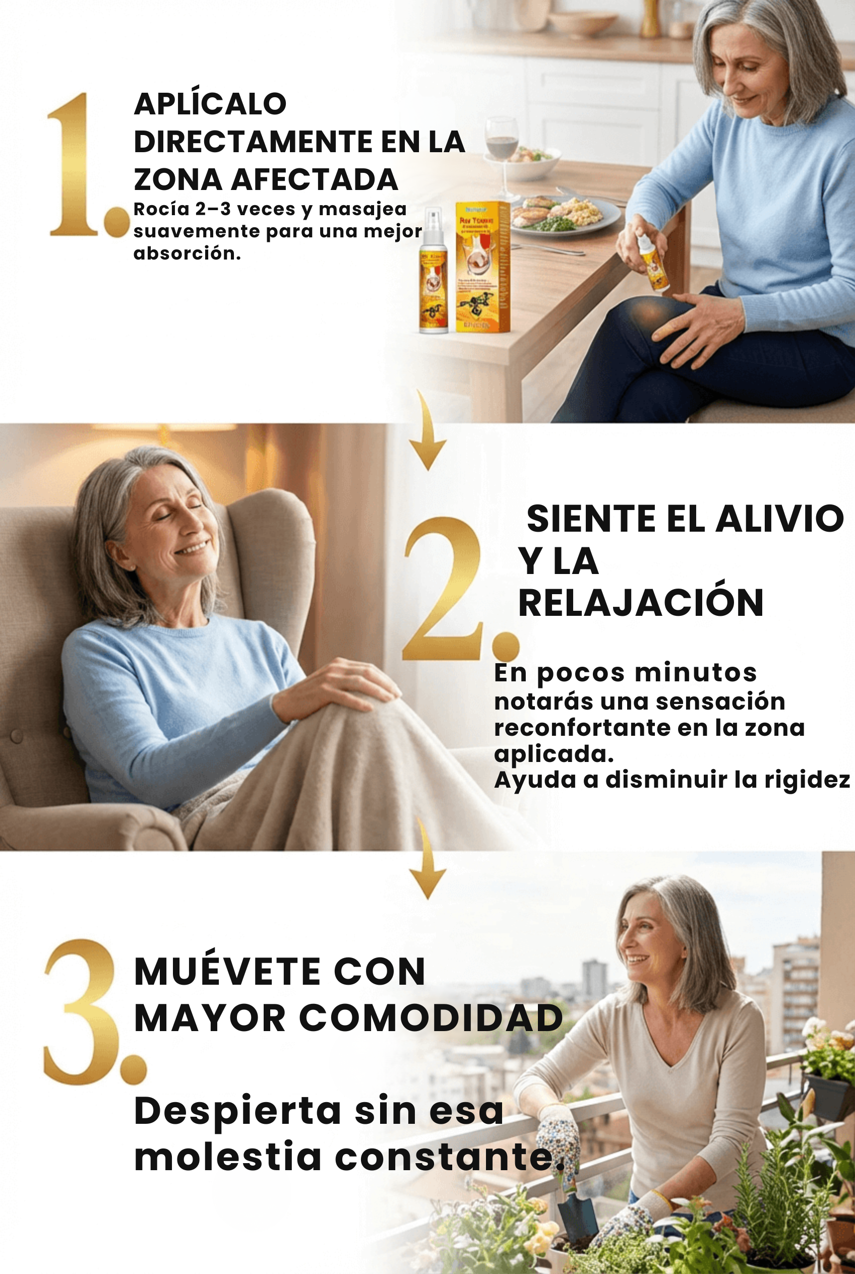 Trabajo muchas horas sentado y el hombro derecho me molestaba bastante. Empecé a usar el spray por las noches y siento que la rigidez ha bajado muchísimo. Se absorbe rápido y no deja la piel pegajosa. Me gustó porque es práctico y fácil de aplicar.